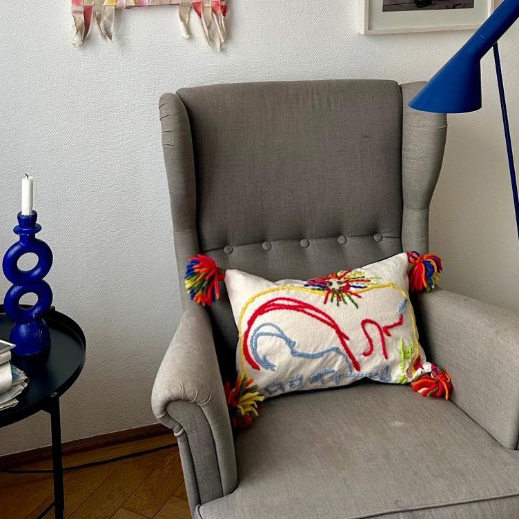 Ich übertrage die schönsten Zeichnungen Ihrer Kinder auf hochwertige Leinenstoffe, besticke dann mit fluffiger Wolle und vernähe sie zu einzigartigen Pölstern.