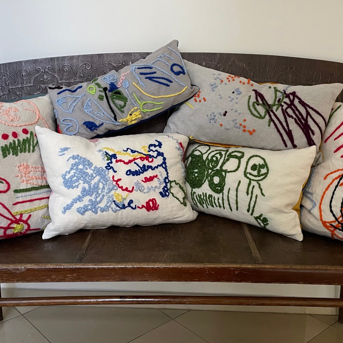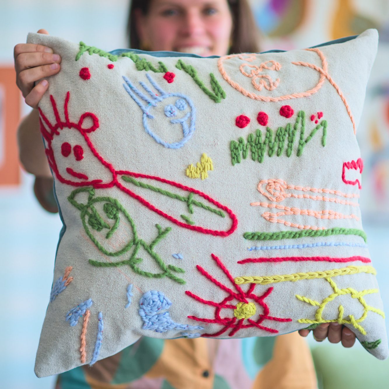 Ich übertrage die schönsten Zeichnungen Ihrer Kinder auf hochwertige Leinenstoffe, besticke dann mit fluffiger Wolle und vernähe sie zu einzigartigen Pölstern.